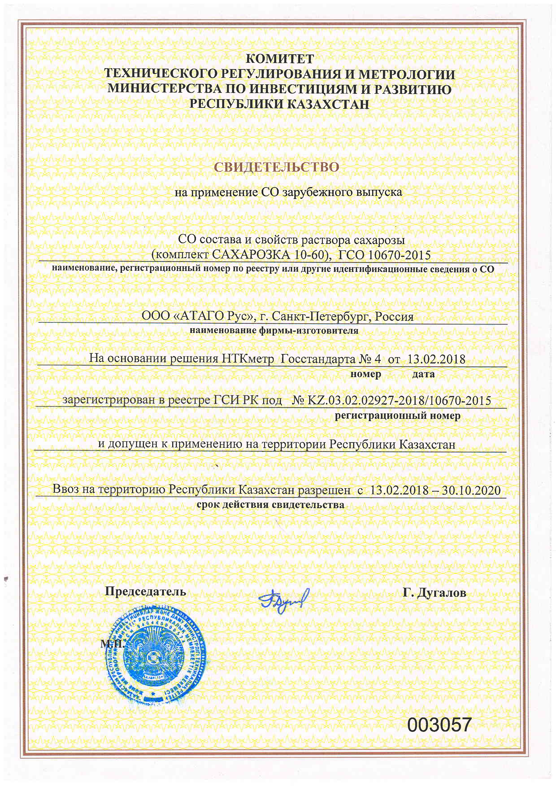 Друзья! Мы рады сообщить Вам, что Стандартный Образец (СО) "Сахарозка 10-60", теперь зарегистрирован в реестре ГСИ РК и допущен к применению на территории Республики Казахстан.