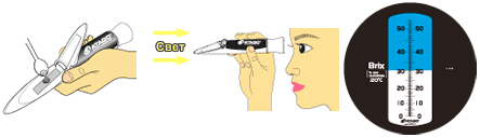 Поместите 2-3 капли образца на призму рефрактометра с помощью пипетки и закройте покрывающую пластину, убедитесь, что образец распределился равномерно. Посмотрите в окуляр. Линия раздела белого и голубого поля - это результат измерений по шкале %Brix.