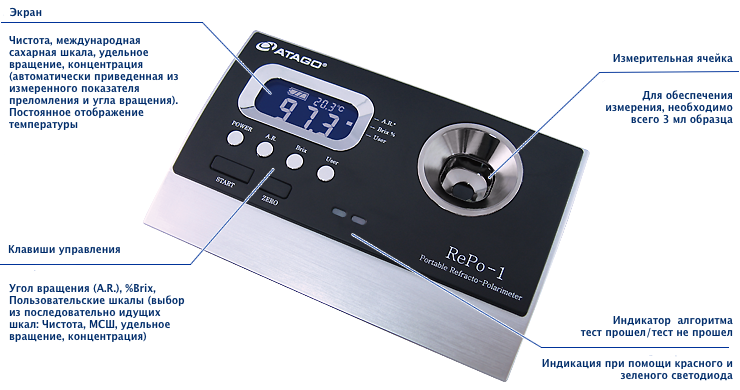 Показатель преломления показывает лишь общую картину, а именно общее содержание растворенных сухих веществ в образце. Рефрактополяриметры RePo способны одновременно измерить и показатель преломления, и угол вращения поляризации. Например, этими приборами можно установить фальсификацию продукта, определив, какое именно вещество входит в состав и какова концентрация данного вещества.