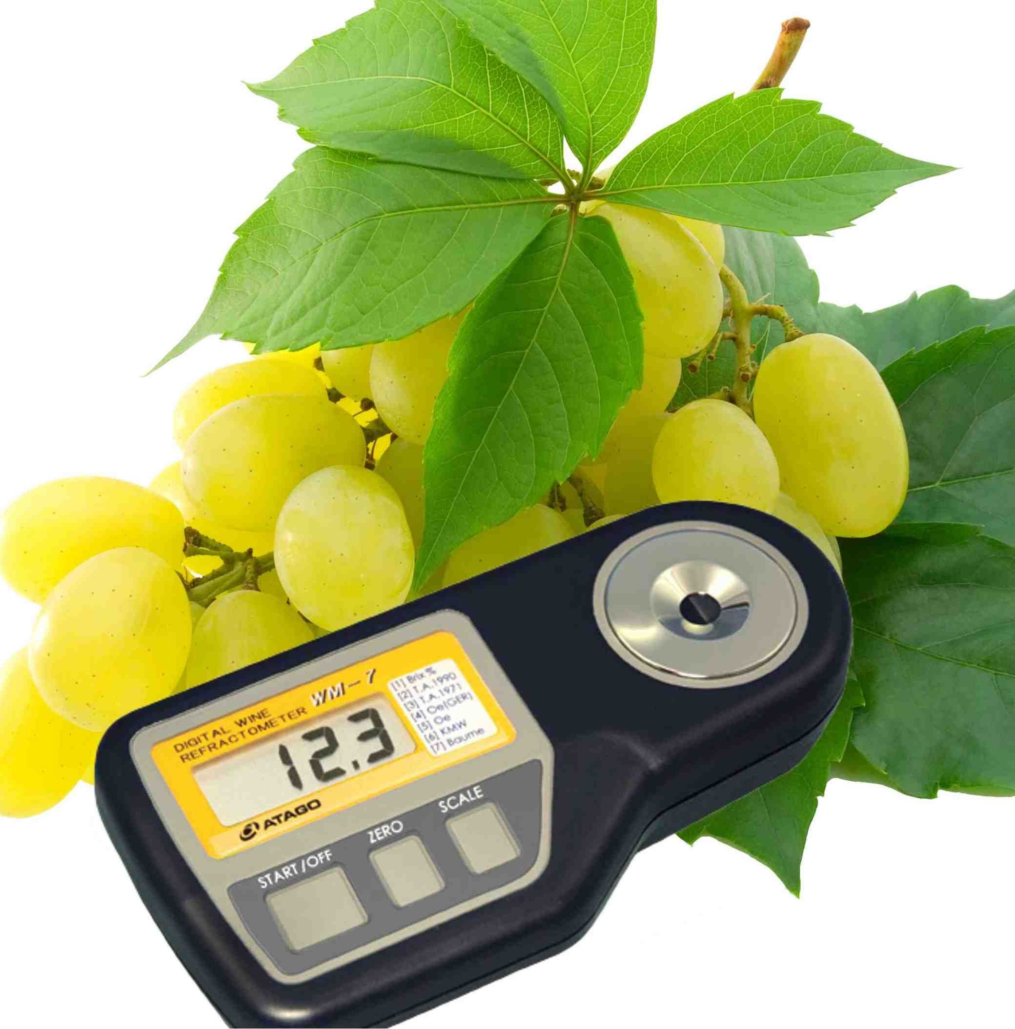 Спелый виноград содержит от 15 до 25% сахара, который в свою очередь состоит из примерно равных частей фруктозы и глюкозы. Хоть сахароза не полностью эквивалентна сахарам в винограде, её добавление в некоторых случаях допускается как средство увеличения содержания алкоголя в конечном продукте. В процессе брожения сахар преобразуется в алкоголь и его содержание уменьшается – именно поэтому необходимо с большой точностью отслеживать все изменения. Рефрактометры позволяют измерять общую концентрацию сухих веществ в полупродукте, которая, очевидно, в процессе брожения изменяется. Помимо рефрактометров существуют такие приборы как поляриметры, которые позволяют выделить именно концентрацию сахара, что даёт ещё более точные результаты при контроле процесса брожения.