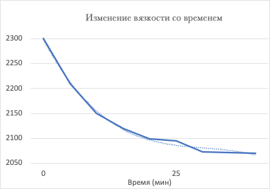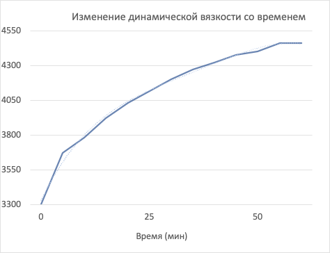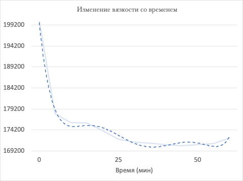 Через час измерений тренд на снижение показаний исчезает, значения стабилизируются. Однако далее вязкость начинает возрастать в следствие засыхания пасты на воздухе. Значение вязкости, предшествующее этому моменту, принимается за истинное.