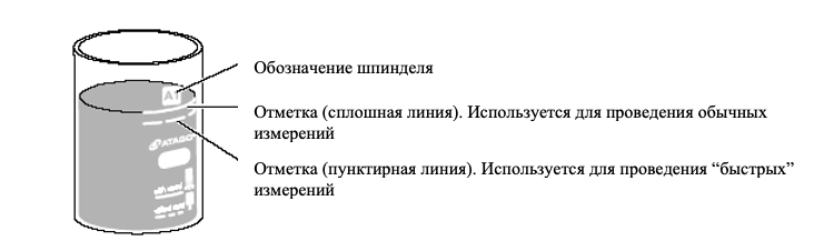 Внутри измерительного стакана располагаются отметки, до уровня которых необходимо заполнить объем в зависимости от выбора того или иного типа шпинделя. Соблюдение этого условия обеспечивает максимальную точность и стабильность результатов.