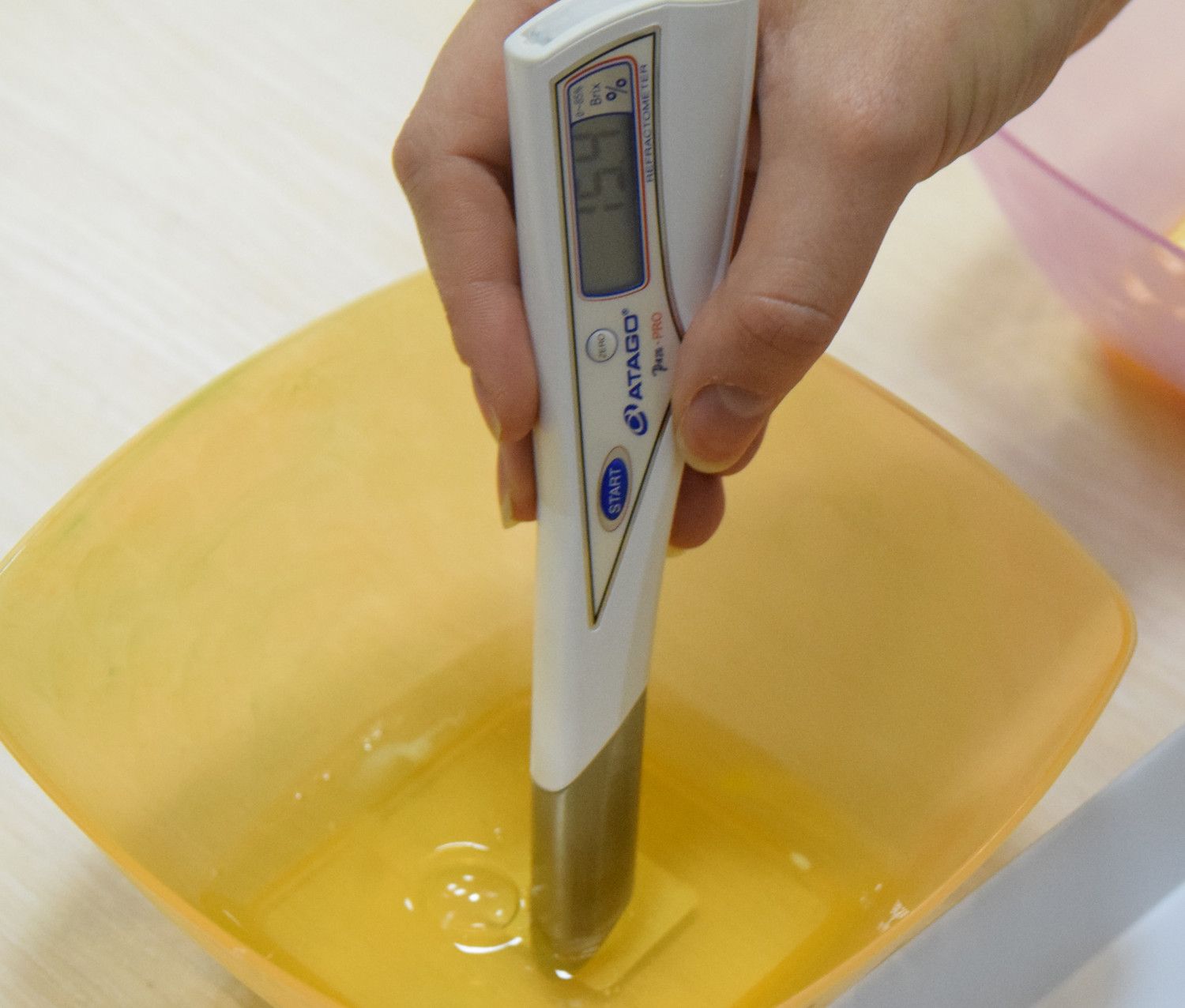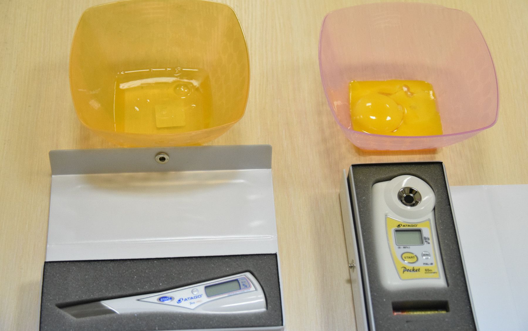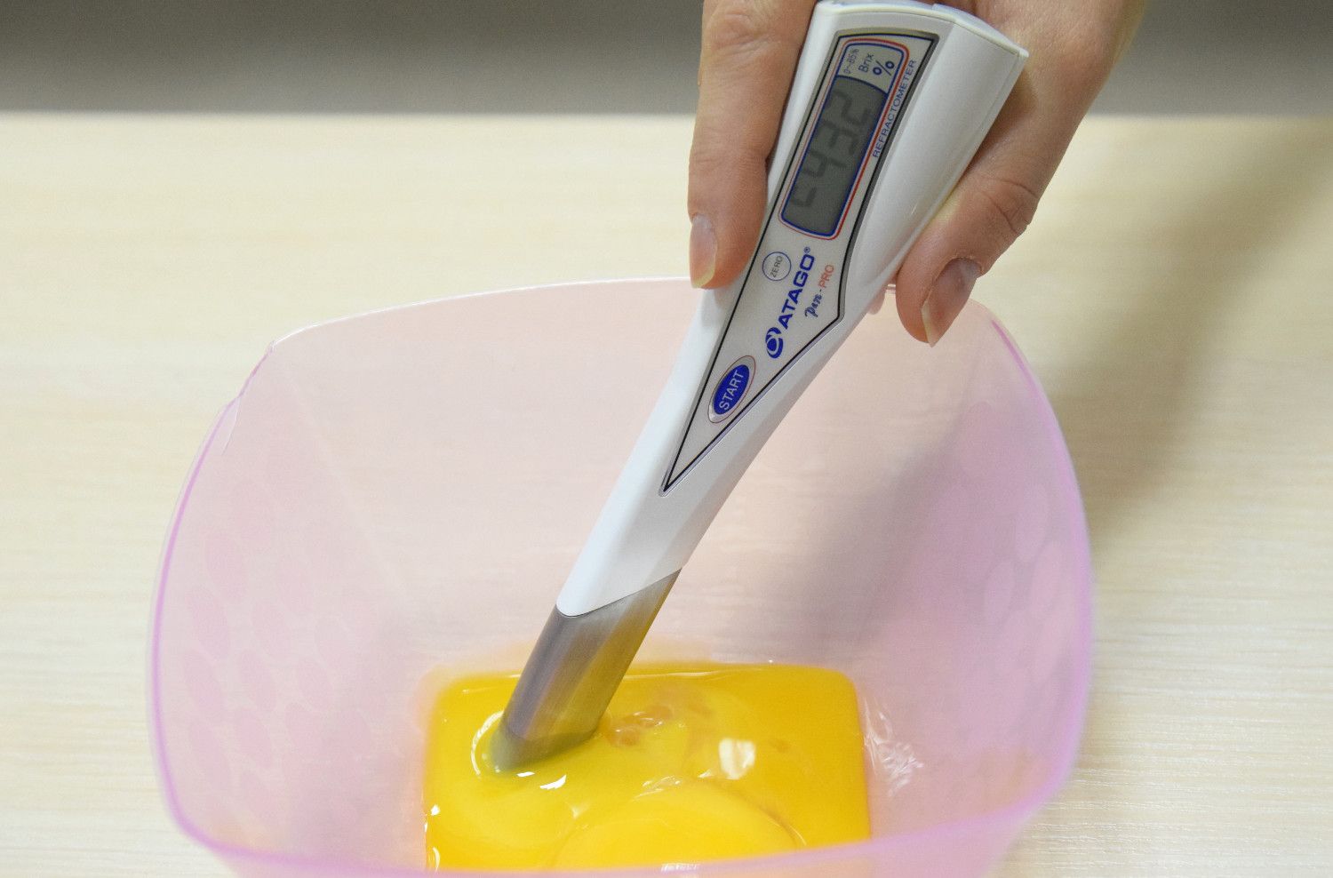 Рефрактометры серии PEN очень удобно использовать для измерений яиц, так как ими можно одновременно перемешивать образец и проводить измерения, без необходимости помещать его в ячейку призмы. У моделей PEN-PRO и PAL-alpha точность составляет 0,2%, а диапазон измерений от 0 до 85 % Brix. чего, как можно убедиться по таблице выше, определённо хватает в нашем случае. Оба прибора можно чистить под струёй воды, а в случае PEN-PRO – просто опускать его в ёмкость с водой, что очень сильно экономит время при большом количестве измерений.
