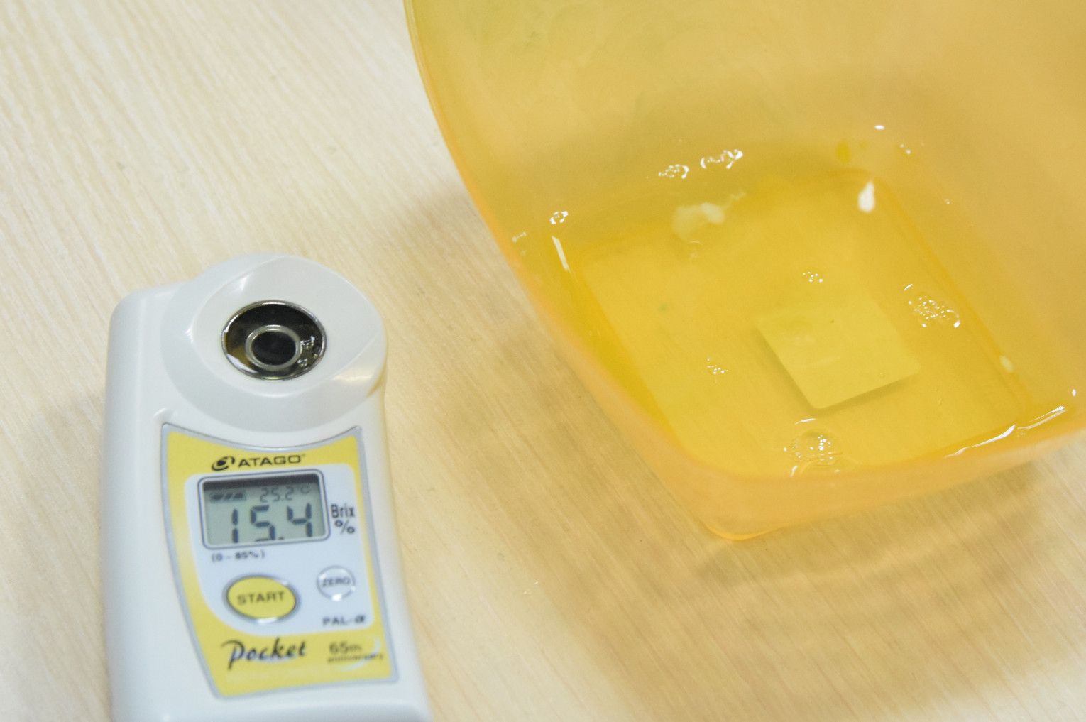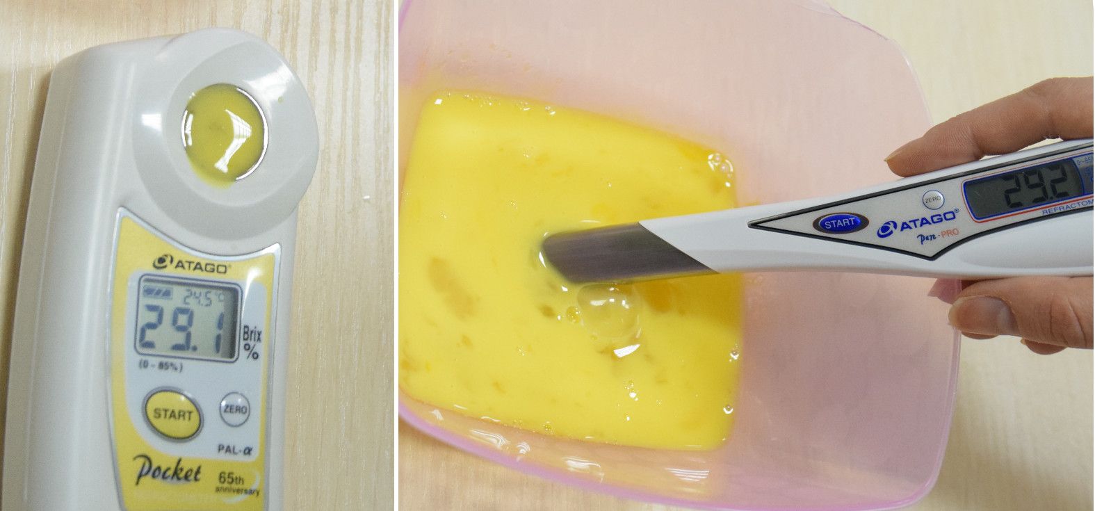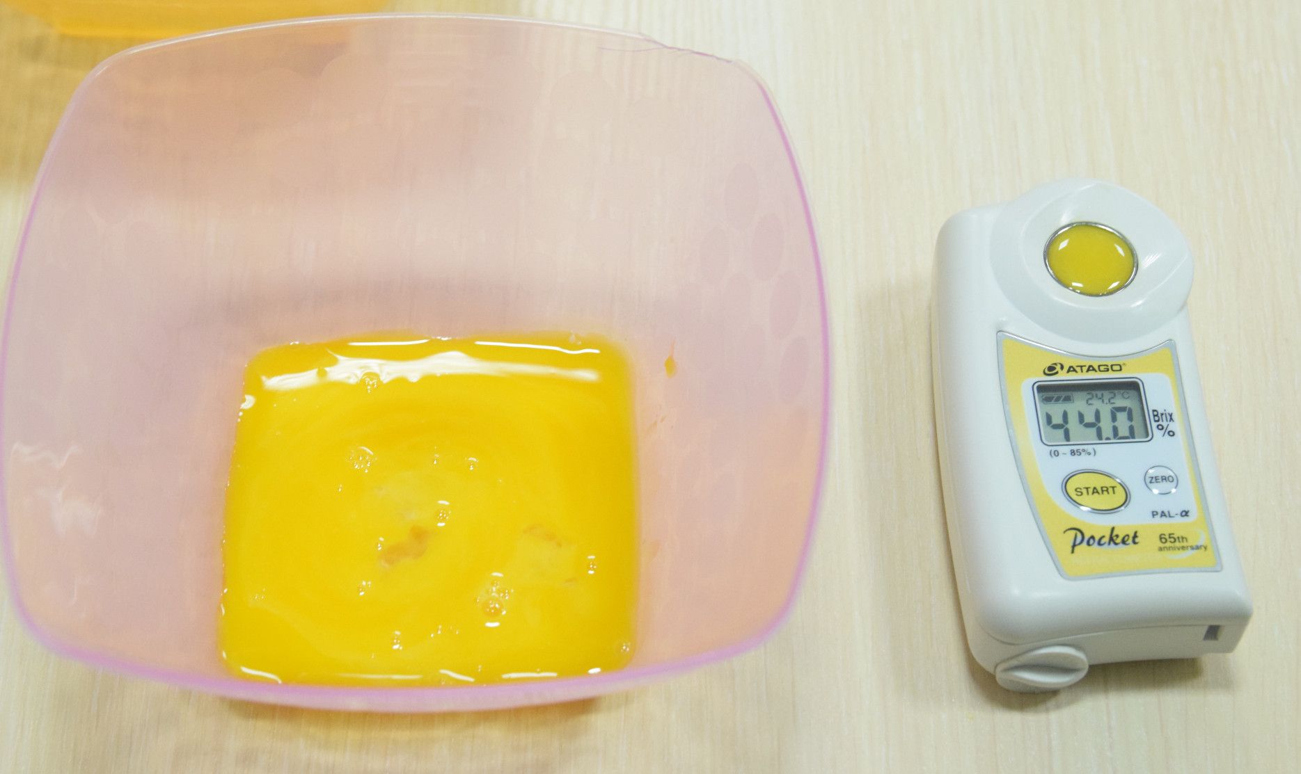 Рефрактометры серии PEN очень удобно использовать для измерений яиц, так как ими можно одновременно перемешивать образец и проводить измерения, без необходимости помещать его в ячейку призмы. У моделей PEN-PRO и PAL-alpha точность составляет 0,2%, а диапазон измерений от 0 до 85 % Brix. чего, как можно убедиться по таблице выше, определённо хватает в нашем случае. Оба прибора можно чистить под струёй воды, а в случае PEN-PRO – просто опускать его в ёмкость с водой, что очень сильно экономит время при большом количестве измерений.