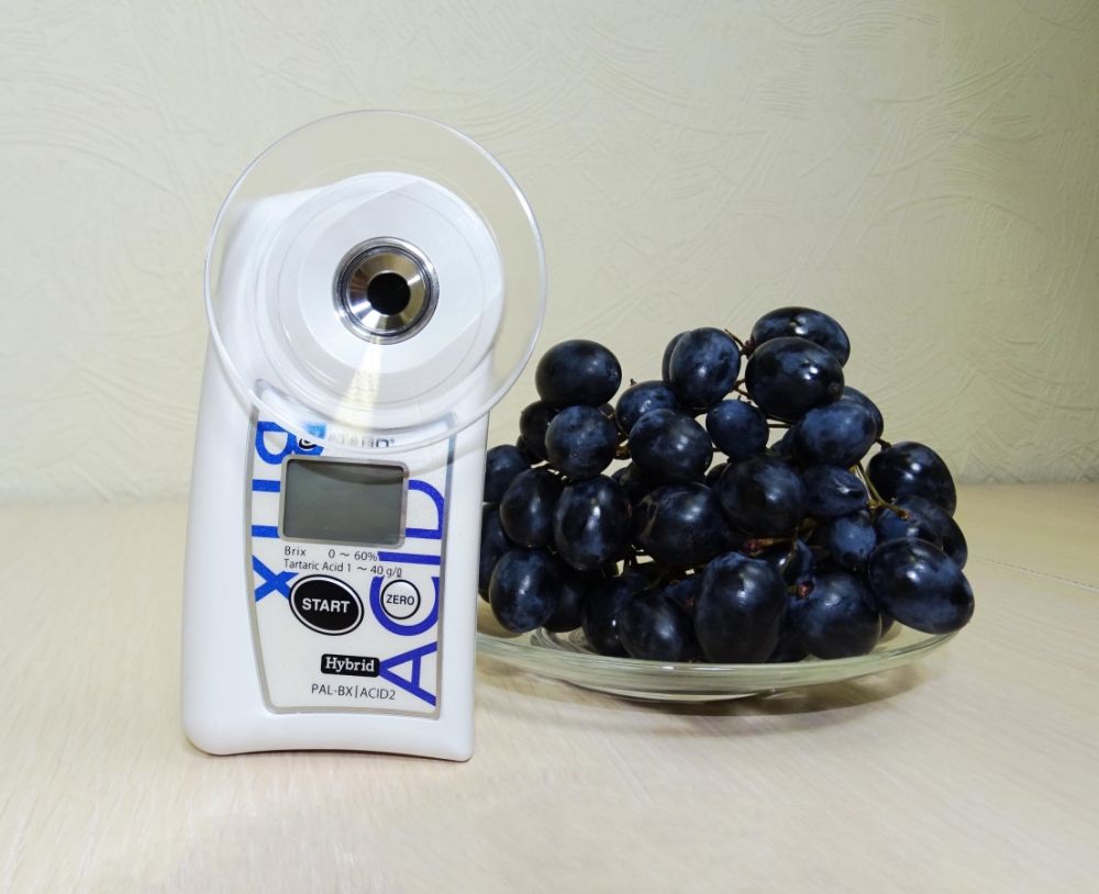 Так как содержание винной кислоты велико в винограде, проведем измерение на свежевыжатом соке самого винограда. Для определения показаний мы воспользуемся рефрактометром PAL-BX/ACID2 компании ATAGO - измерителем винной кислоты. Необходимо несколько капель образца нанести на призму таким образом, чтобы не осталось пузырьков, и нажать кнопку "Start". После этого на экране выводится числовое значение - показания сухого остатка %Brix. Чтобы узнать содержание винной кислоты в винограде, необходимо разбавить имеющийся образец на призме дистиллированной водой до отметки на воронке (около 10мл) и нажать кнопку "Start". Далее видим второе числовое значение - это кислотность винограда (г/100мл).