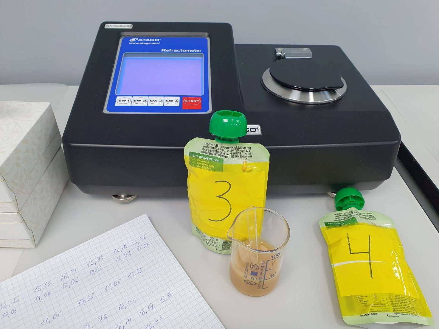 Было проведено измерение двух объектов исследования (пюре груши и яблока по два образца каждого) с помощью двух режимов MODE 1 и MODES с разной температурой (20 °C и 30 °C) также была использована крышка Magic для сложных, неоднородных и летучих образцов ,чтоб получить более стабильные результаты негомогенного пюре. В результате измерений на автоматическом рефрактометре RX-5000 alpha были сформированы таблицы с шестикратной повторностью измерения по каждому из вариантов.