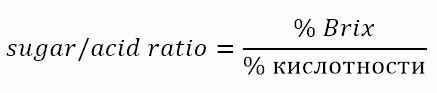 Как известно, преобладающей кислотой в цитрусовых является лимонная кислота. Поэтому общая кислотность в некоторых случаях может быть заменена на концентрацию лимонной кислоты. В этом случае сахарокислотный коэффициент рассчитывается по следующей формуле и может быть определён с помощью одного прибора (например, PAL-BX/ACID 1)