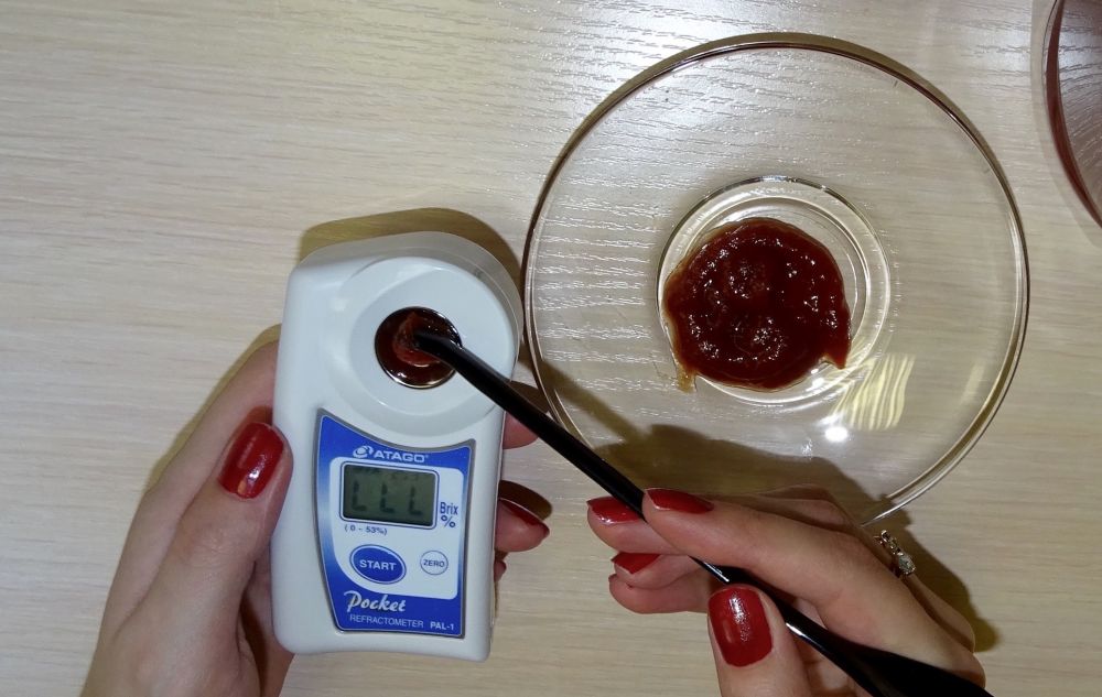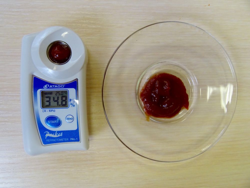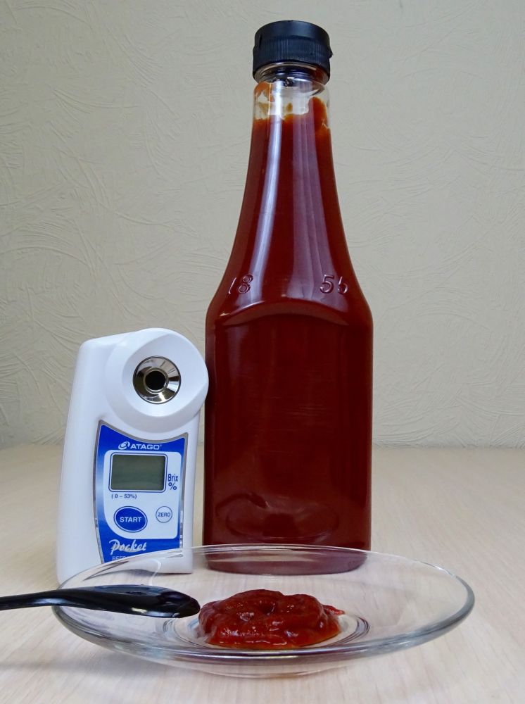 Чтобы измерить концентрацию массовой доли растворимых сухих веществ (сахара) в кетчупе необходим рефрактометр. Представляем вашему вниманию японские рефрактометры ATAGO. Существуют различные рефрактометры: как стационарные, так и портативные. Например, цифровые портативные рефрактометры с низкой концентрацией, такие как: PAL-1, PR-32 alpha. Также есть оптические портативные рефрактометры серии Master: Master-alpha/Palpha, Master-T/PT, Master-M/PM. Мы проведем измерение на примере цифрового «карманного» рефрактометра PAL-1.