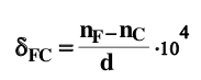 Как уже отмечалось, величина показателя преломления зависит от длины волны. Различие в преломлении лучей называется дисперсией (рассеиванием) света. В качестве меры дисперсии часто употребляется разность показателей преломления для двух длин волн, называемая частной дисперсией. Частная дисперсия для синий (F, 488.1 нм) и красной (С, 656.3 нм) линий спектра водорода, охватывающих среднюю часть видимого спектра, называется средней дисперсией. Разница показателей преломления вещества для синий и красной линий спектра водорода, отнесенная к плотности вещества называется удельной дисперсией. При исследовании нефти и углеводородов находят применение выражения для удельной дисперсии, основанные на формуле Гладстона-Даля;