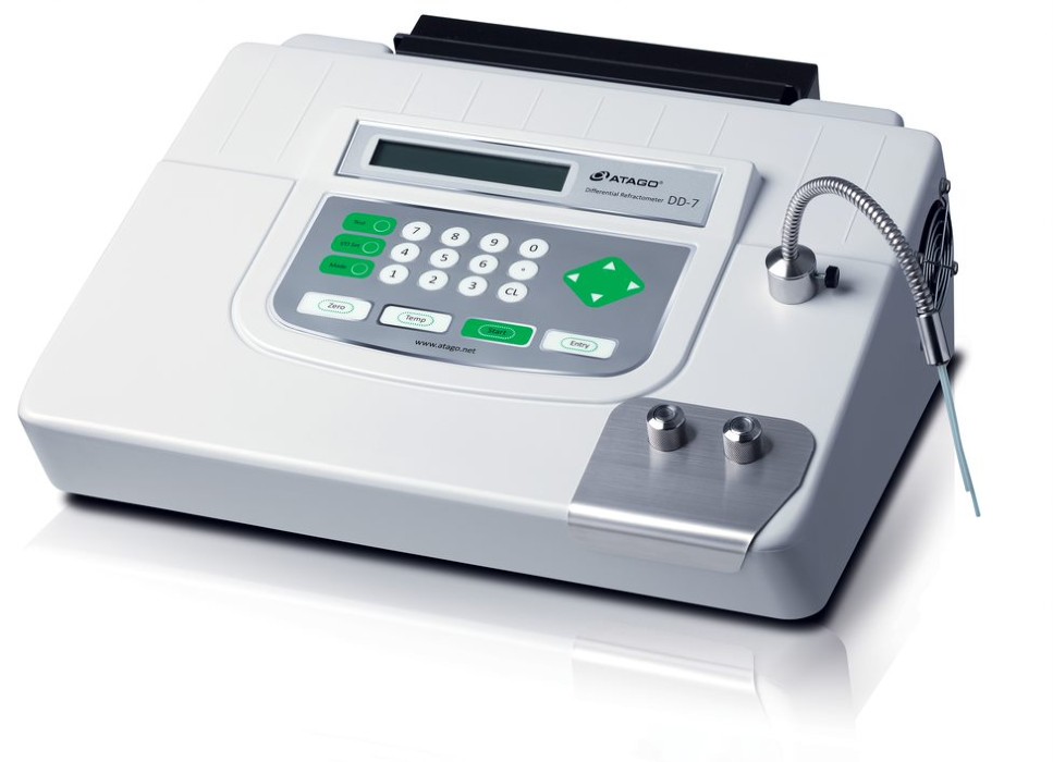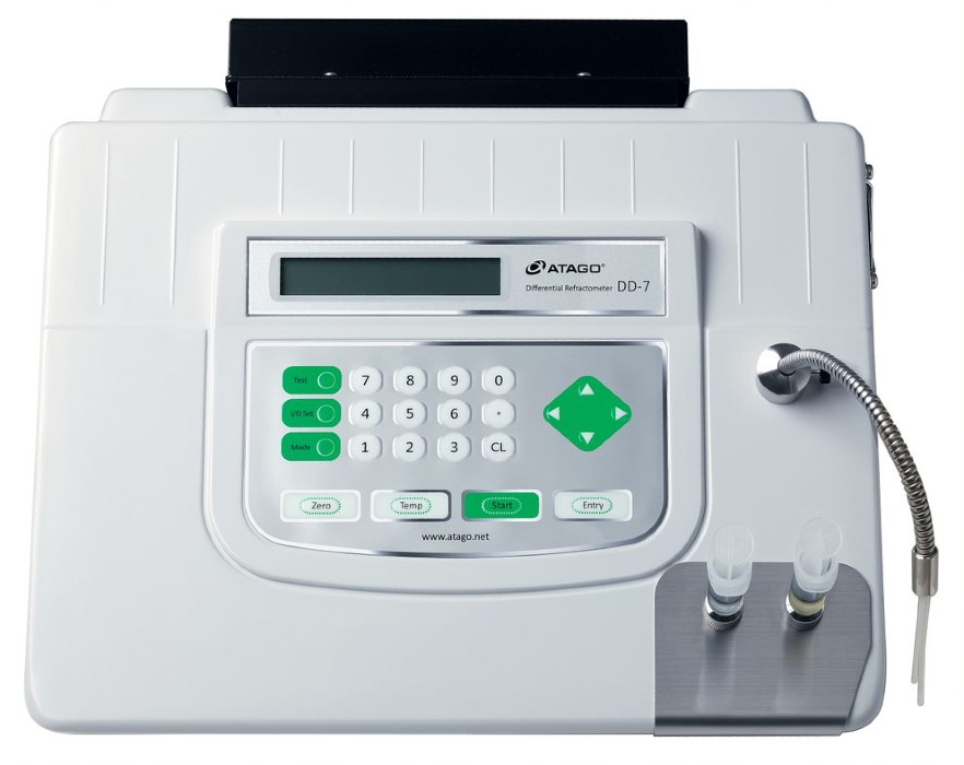 Эта модель специально создана для измерения растворов, имеющих низкую концентрацию до 2% Brix, с очень высоким уровнем точности (±0.005% Brix). Прекрасно подойдет для таких образцов, как несладкий чай, травяные экстракты, кофе, поверхностно-активные вещества. Для измерения необходимо иметь два образца: раствор сравнения и сам образец, который нужно измерить. При измерении растворов с концентрацией ниже 2% Brix, в качестве раствора сравнения подойдет дистиллированная вода. При использовании других растворов сравнения (более концентрированных, чем дистиллированная вода) также можно измерять образцы с более высокой концентрацией (до 1.50 nD). На передней панели рефрактометра расположены два локализованных отверстия: для ввода образца и раствора сравнения. Прибор имеет трубку для слива остатков образца после измерения. DD-7 не подходит для измерения образцов с высокой вязкостью. Возможна передача данных на принтер или компьютер через RS-232C порт.
