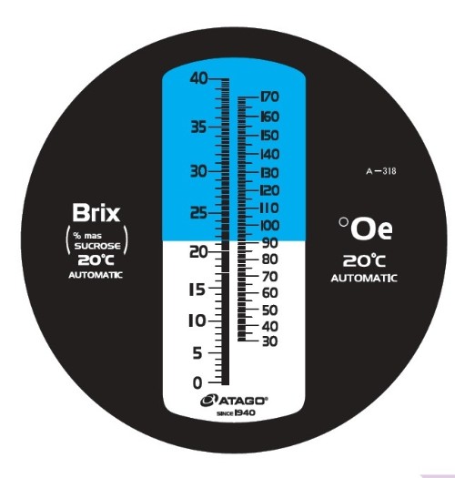 Ручной оптический рефрактометр для определения концентрации виноградного сусла. Имеет две шкалы: градусы Oe (Oechsle (Эксле)) и Brix %.