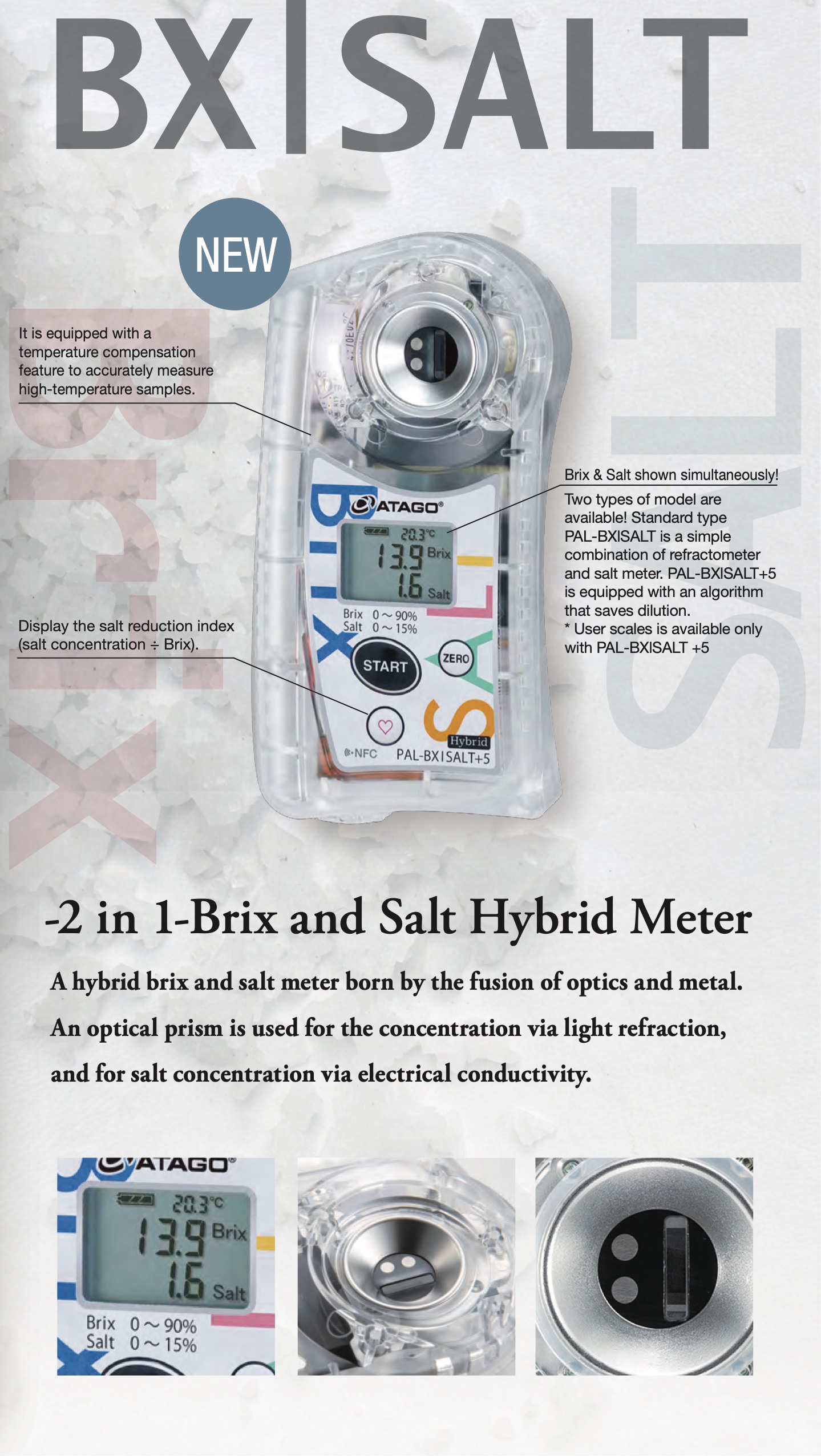 Контроль качества продуктов стал намного легче! Новый гибридный рефрактосолемер сочетает в себе фактически два разных, по принципу измерения, прибора. Рефрактометрическая часть прибора измеряет %Brix, кондуктометрическая часть прибора измеряет %соленость при помощи титановых электродов. В результате за одно измерение получаем результат по сухому остатку (концентрация) и солености объекта исследования