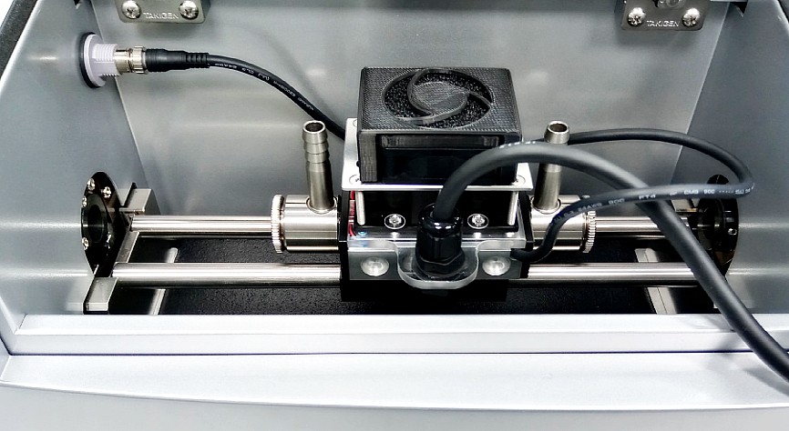 Термостатируемая ячейка размещается внутри камеры для образцов, а температура настраивается и регулируется с помощью блока управления снаружи. После установки температуры термостат автоматически доводит образец для нужной температуры и поддерживает ее во время измерений. Необходимо отметить, что данный тип термостатирования подходит для проведения измерений с кюветой длиной 100 мм.