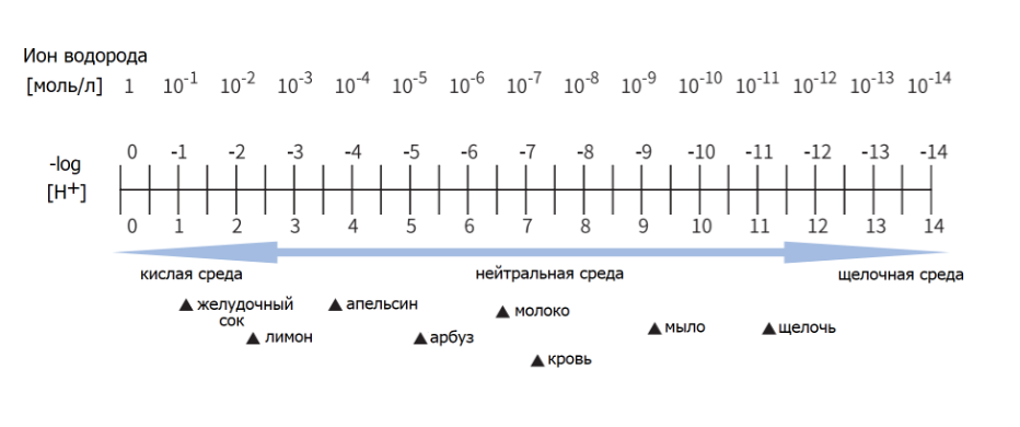 Диапазон возможных значений pH составляет от 0 до 14, где 7 соответствует нейтральной среде, значение pH ниже 7 – кислой среде, выше 7 – щелочной. Кислотность увеличивается с уменьшением значения pH, а щелочность – с увеличением значения. Жидкости с горьким вкусом, такие как уксус, сок и щелочь (зола, растворенная в воде), являются щелочными. Нейтральность (pH 7) означает, что концентрация ионов водорода составляет 10-7 (0,0000001) моль на литр.