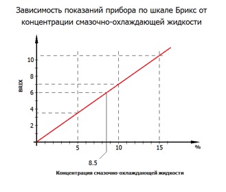 При измерении концентрации различных водных растворов, таких как водорастворимая СОЖ, чистящий раствор, ингибитор коррозии, гидравлическая жидкость, этиловый спирт, раствор перекиси водорода, глицерин, антифриз и гидроксид натрия, с помощью рефрактометра (или бриксметра[1]) используется метод градуировочного графика (графика преобразования), связывающий показания прибора по шкале Брикс (или показателя преломления) и концентрацию. Градуировочный график готовится заранее.