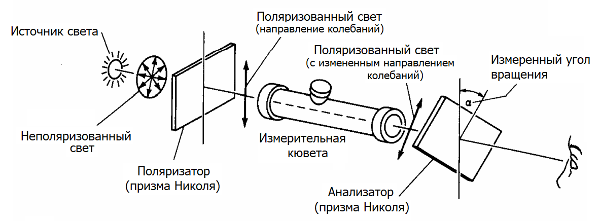 Принцип поляриметрических измерений состоит в числовой оценке угла поворота α плоскости поляризации линейно поляризованного излучения при его прохождении через оптически активное вещество[1].