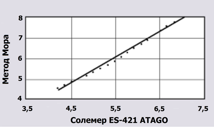 Например, полученные результаты таковы: метод Мора дал результат 4,5% для образца, ES-421 дал результат 4,2%. Когда метод Мора дал 5,9%, ES-421 / PAL-SALT дал 5,5%. Когда метод Мора дал 8,0%, ES-421 / PAL-SALT дал 7,0% и так далее. На графике, приведенном на Рис.1, результаты измерений отмечены точками.