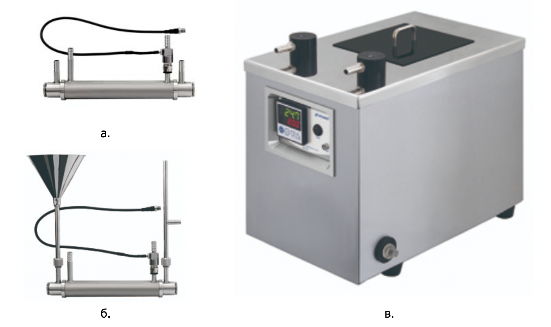 Как правило, при использовании способа ① постоянная температура жидкости в измерительной кювете устанавливается быстрее и более стабильна, чем при способе ②. Для осуществления способа ① поддержания температуры компанией ATAGO были разработаны измерительные кюветы специальной конструкции (см. Рис.1а). Если не требуется высокая точность измерения угла поворота плоскости поляризации (или преобразованного значения удельного вращения), то в помещении, где находится поляриметр, достаточно поддерживать температуру около 20,0 ℃, например, с помощью кондиционера (способ ②).